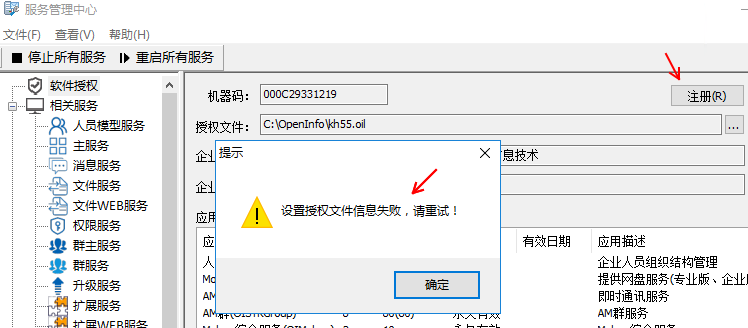 1、在注冊的時候,出現(xiàn)《設(shè)置授權(quán)文件信息失敗,請重試!》