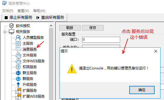 2、點擊服務(wù)的時候,出現(xiàn)《請退出Console,用右鍵以管理員身份運行》