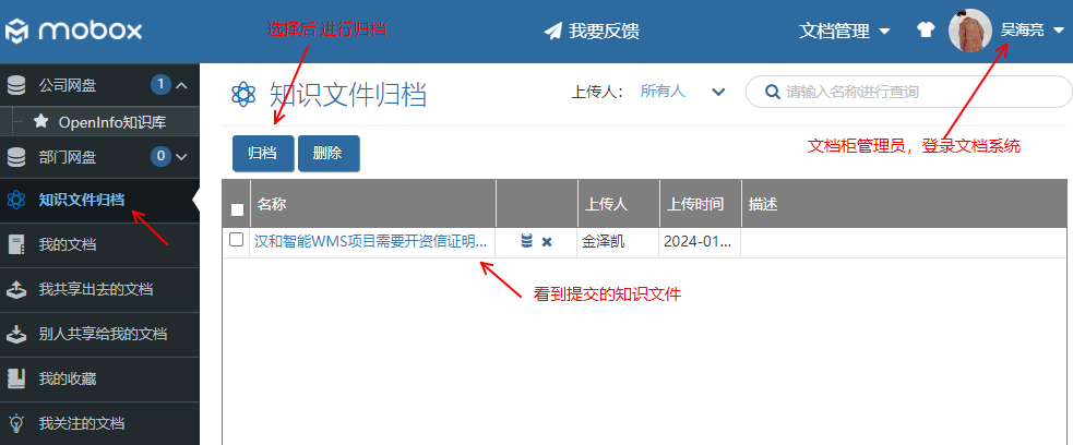上述設(shè)置好后,文檔柜管理員就能進(jìn)行知識庫歸檔的操作