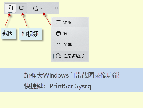 windows自帶截圖、錄屏功能(使用鍵盤中的PrintScr Sysrq 鍵實(shí)現(xiàn)),其位于鍵盤的右上方,按下此鍵,就可以實(shí)現(xiàn)在當(dāng)前屏幕、錄屏,錄視頻等超級(jí)實(shí)用功能。