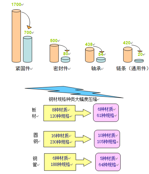 下圖是國內某叉車集團在實施PDM系統前后對標準件、通用件、材料規格數量的一個對比。